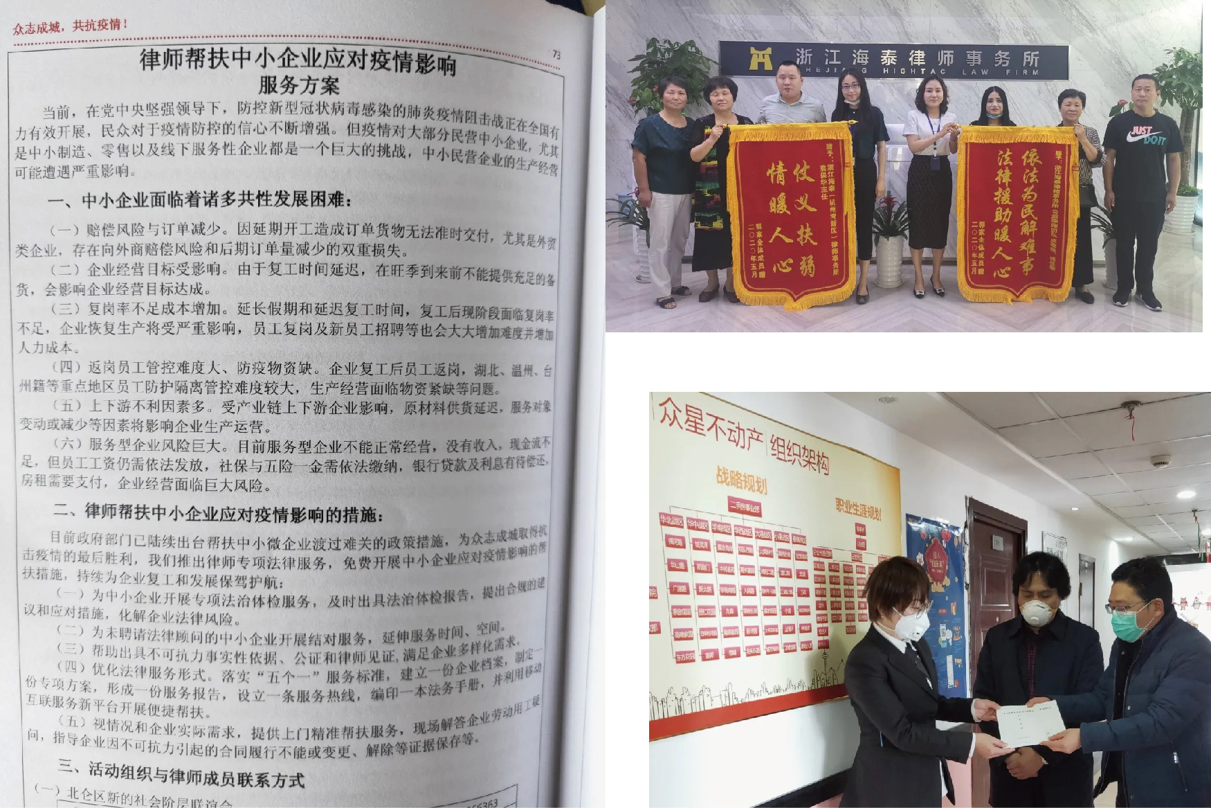 高级合伙人徐建民参加县市区组织的复工复产座谈会数余次,直接参与到市政府抗疫复工复产工作小组一线值班,并开展公益直播带货三次,场场获10万多人围观。邬辉林主任入选省司法厅、省工商联防控疫情律师公益服务团,为省内企事业单位开展线上线下法律讲座27场。海泰开发区吴克汀律师设计《中小企业应对疫情走访帮扶登记表》深入走访众星、中集、东华等数十家企业,并与北仑区中小企业服务中心联合编印《中小企业应对疫情法律帮扶服务手册》,吴克汀律师团队通过网络答疑、电话咨询、线上培训和推送法律文本资料等多种形式,为企业提供涉疫法律咨询 60 余次。杨静律师作为海泰FAST公益负责人在疫情期间积极作为,被宁波市司法局授予“战疫先锋”荣誉称号。