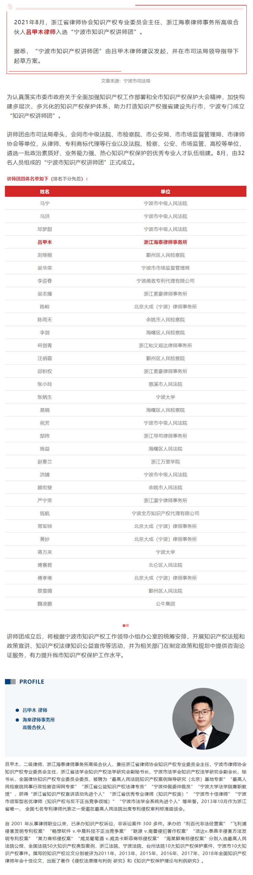 吕甲木律师入选“宁波市知识产权讲师团” | 海泰荣誉