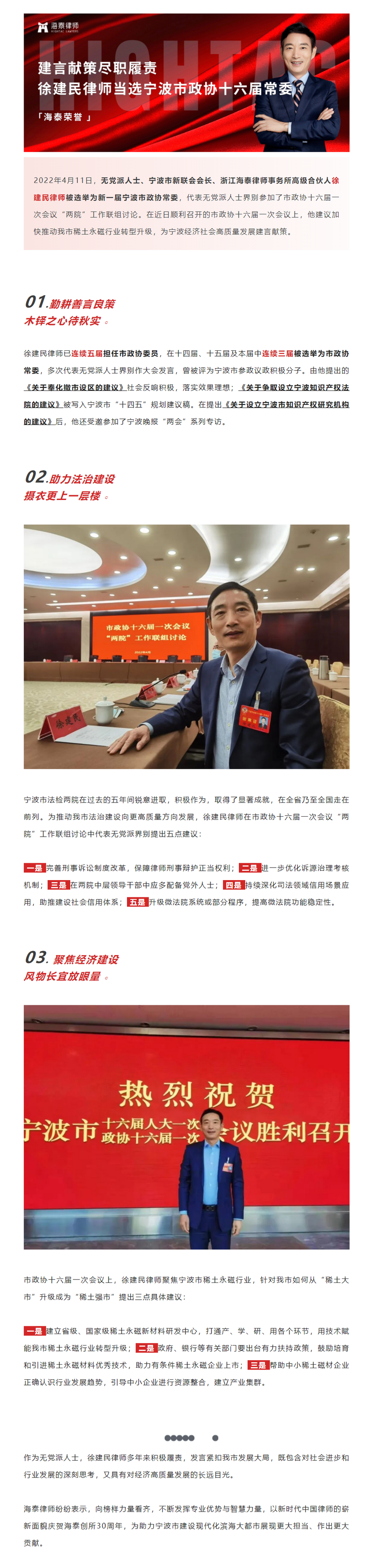 徐建民律师当选宁波市政协十六届常委,建言献策尽职履责 | 海泰荣誉