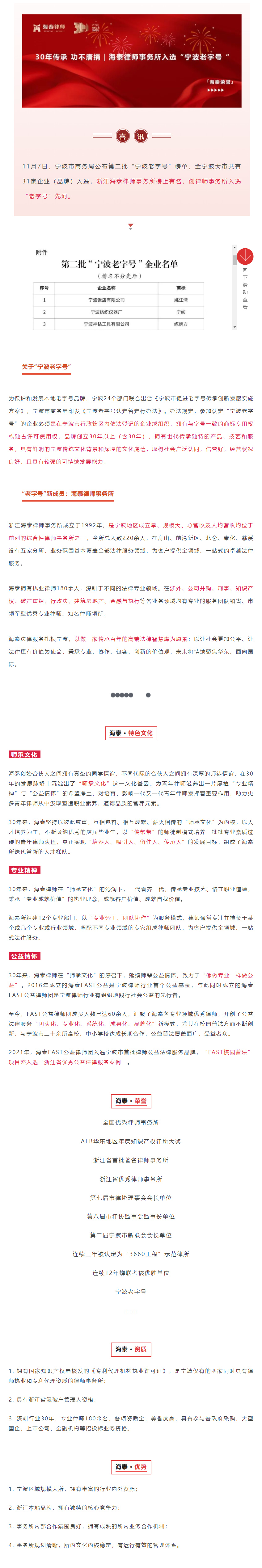 30年传承 功不唐捐|海泰律师事务所入选“宁波老字号”