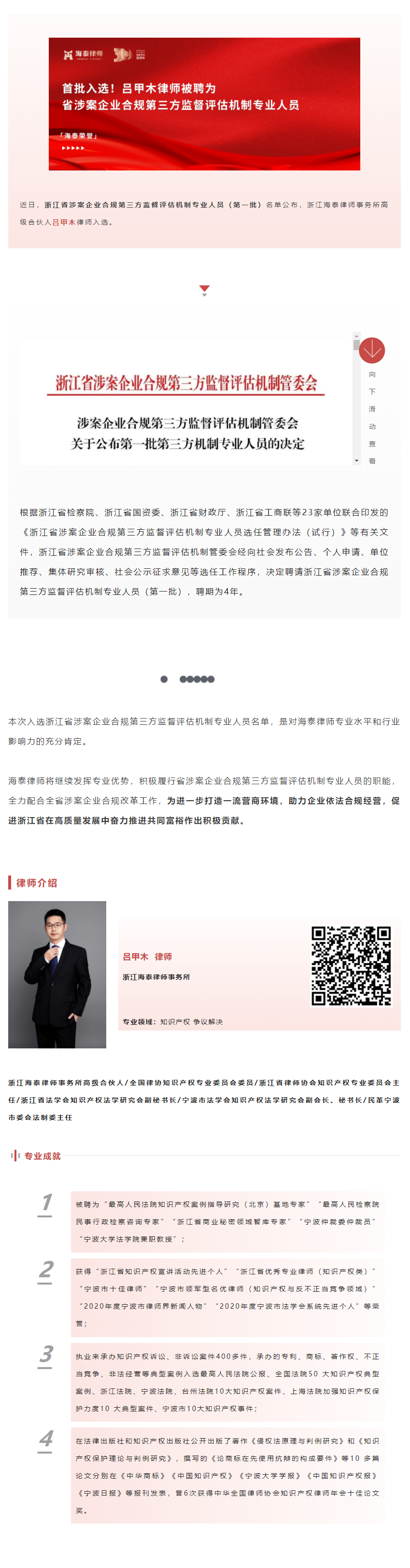 首批入选!吕甲木律师被聘为省涉案企业合规第三方监督评估机制专业人员 | 海泰荣誉