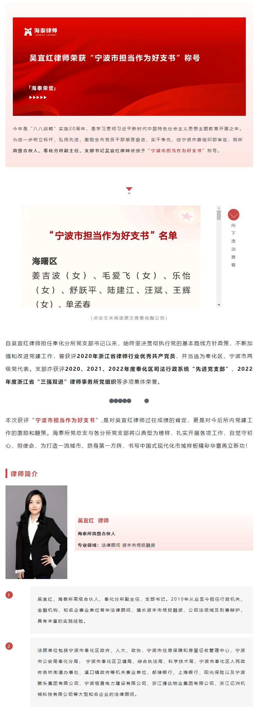 吴宜红律师荣获“宁波市担当作为好支书”称号 | 海泰荣誉