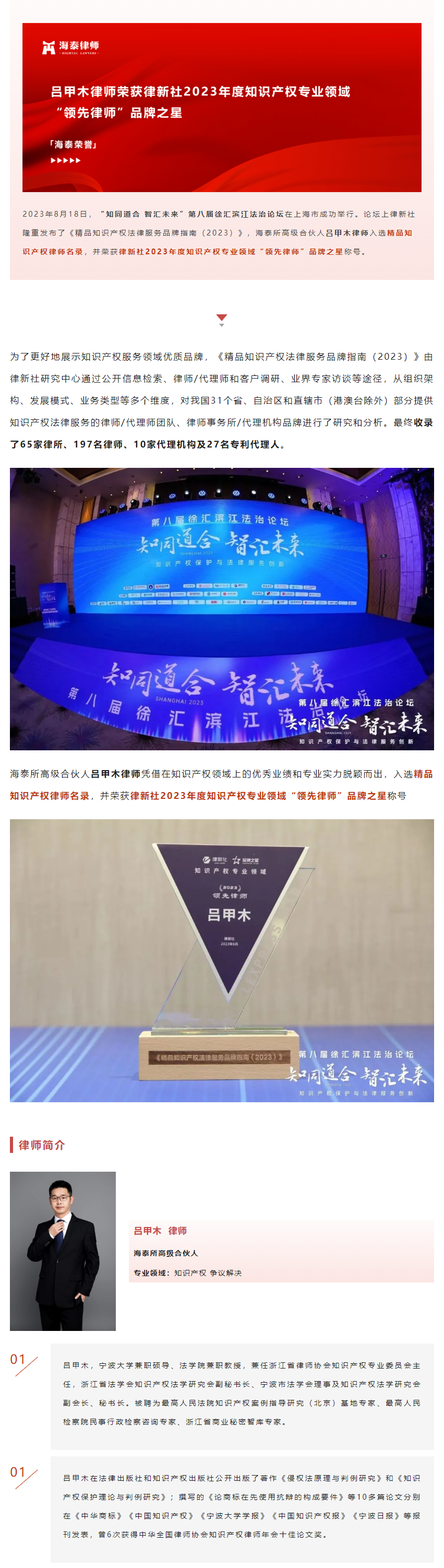 吕甲木律师荣获律新社2023年度知识产权专业领域“领先律师”品牌之星 | 海泰荣誉