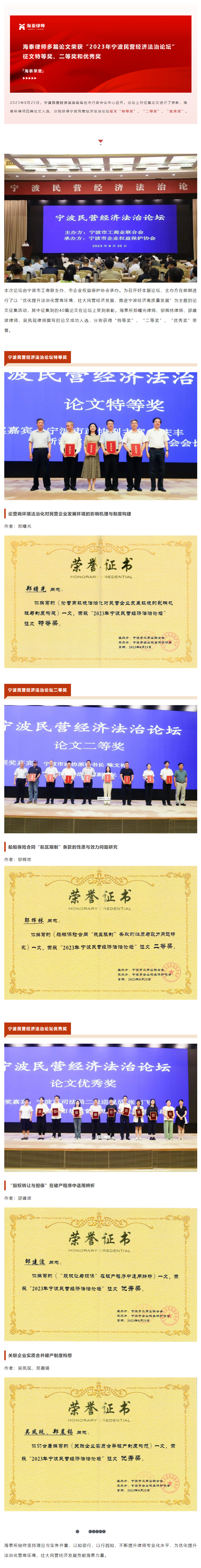 海泰律师多篇论文荣获“2023年宁波民营经济法治论坛”征文特等奖、二等奖和优秀奖 | 海泰荣誉