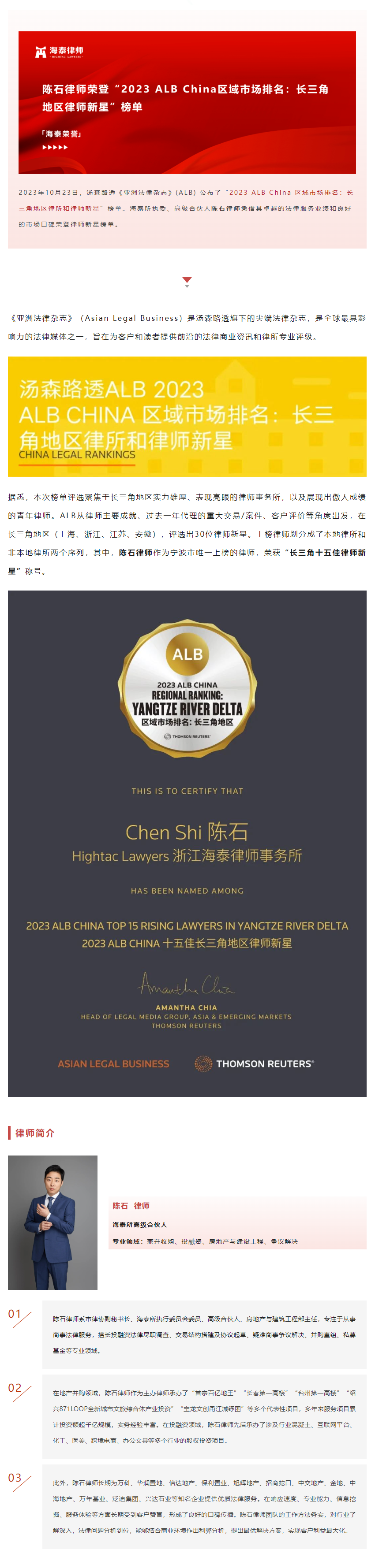 陈石律师荣登“2023 ALB China区域市场排名:长三角地区律师新星”榜单 | 海泰荣誉