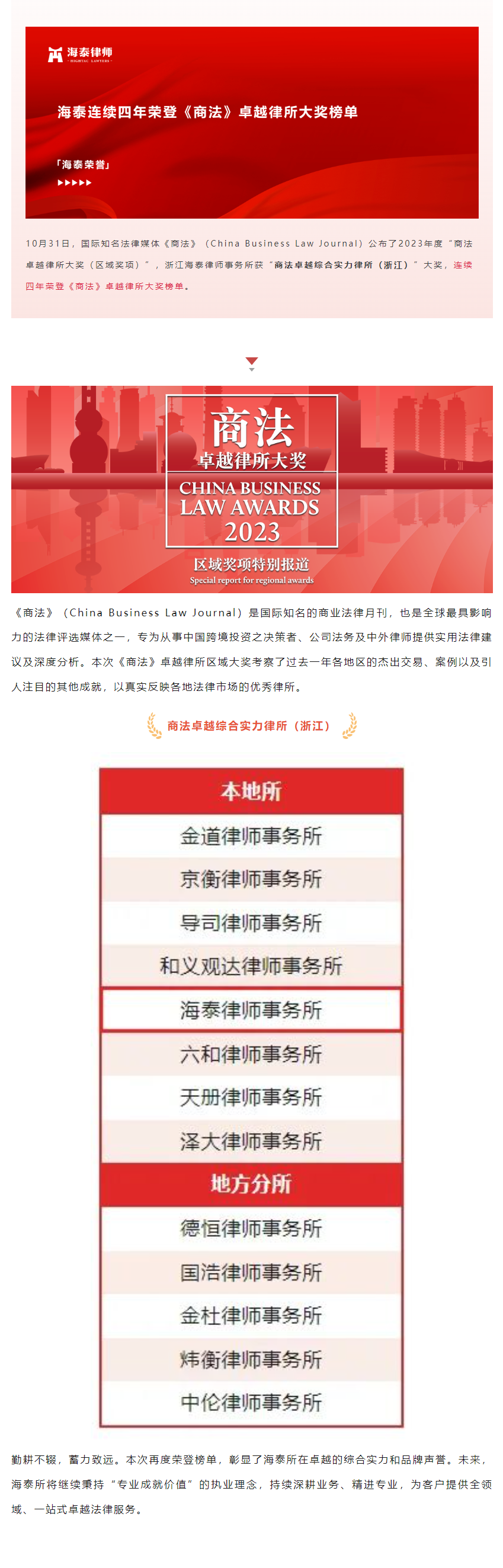 海泰连续四年荣登《商法》卓越律所大奖榜单