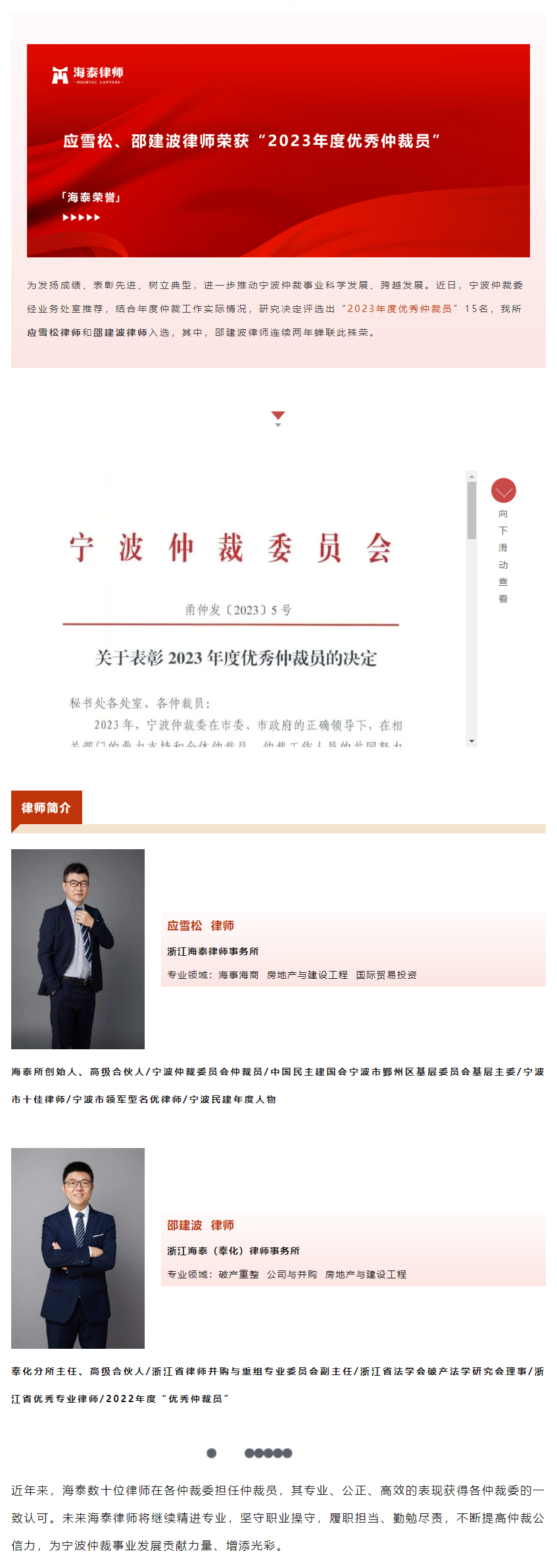 应雪松、邵建波律师荣获“2023年度优秀仲裁员”