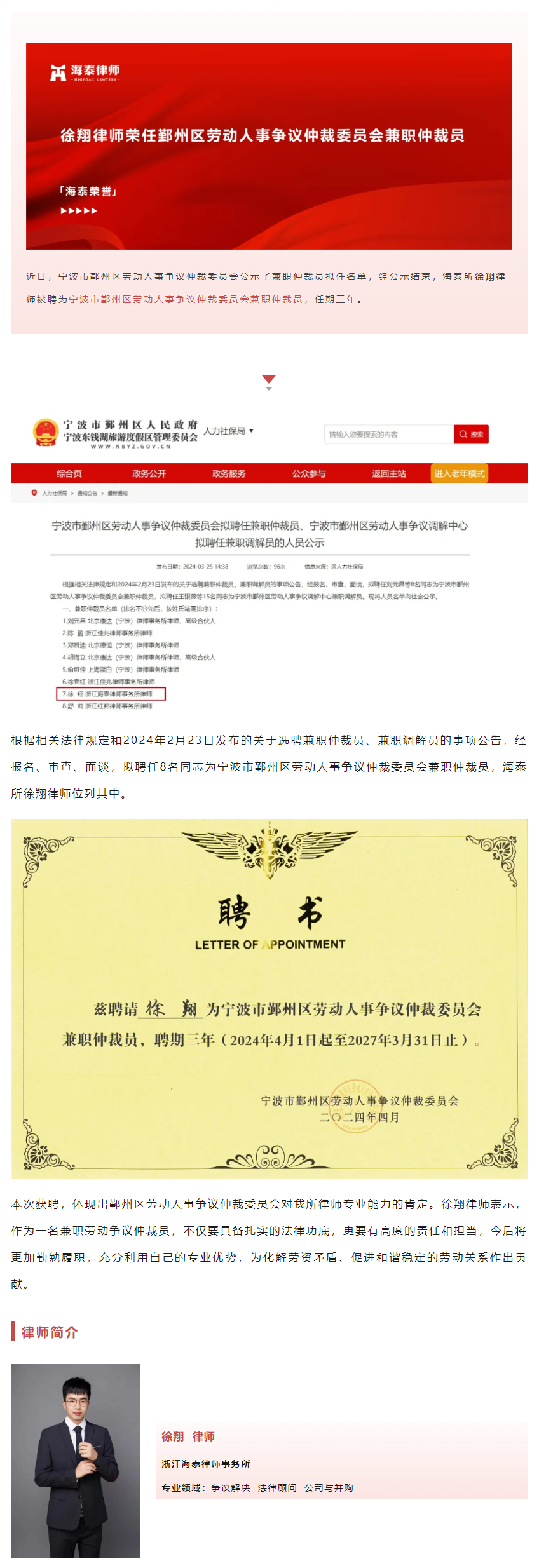 徐翔律师荣任鄞州区劳动人事争议仲裁委员会兼职仲裁员