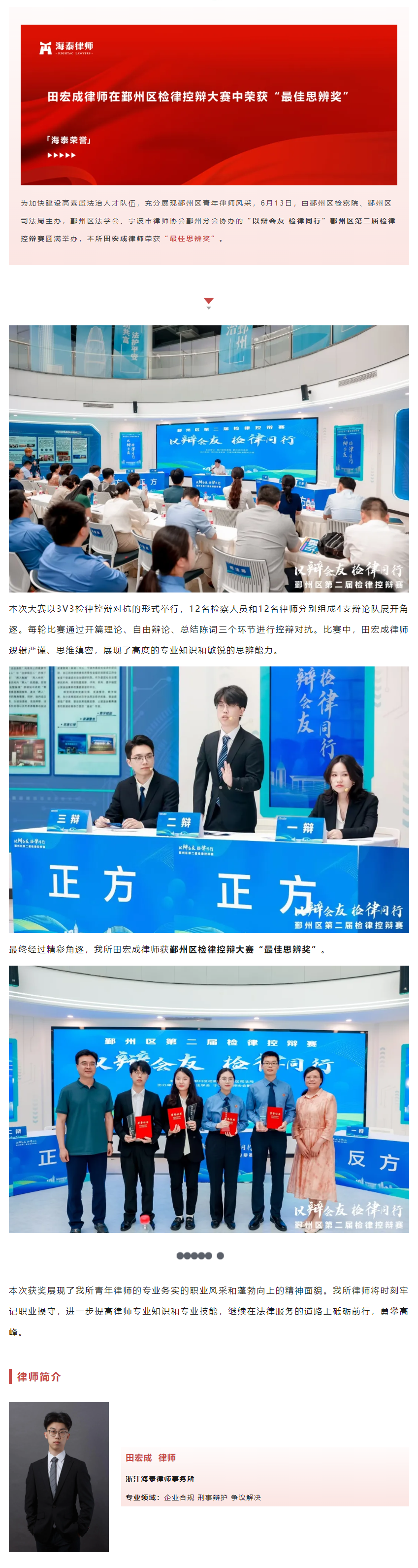 田宏成律师在鄞州区检律控辩大赛中荣获“最佳思辨奖”