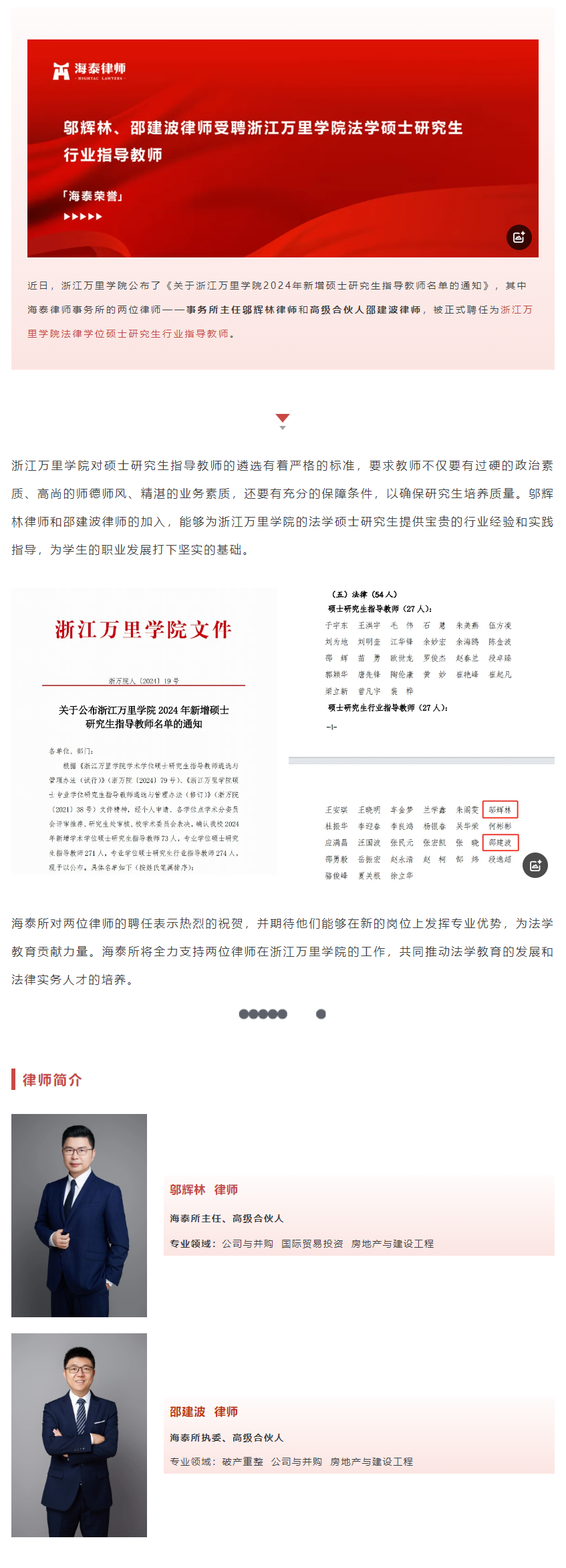 邬辉林、邵建波律师受聘浙江万里学院法学硕士研究生行业指导教师