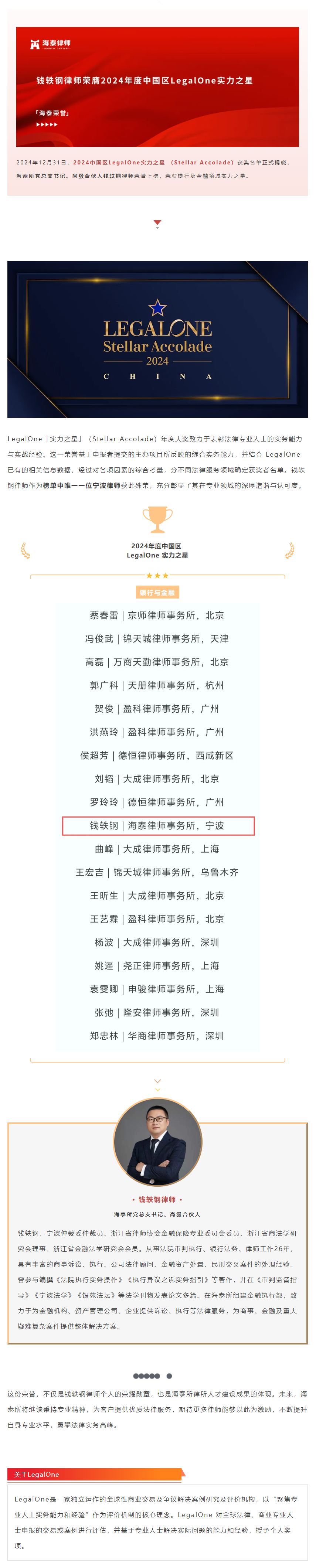 钱轶钢律师荣膺2024年度中国区LegalOne实力之星