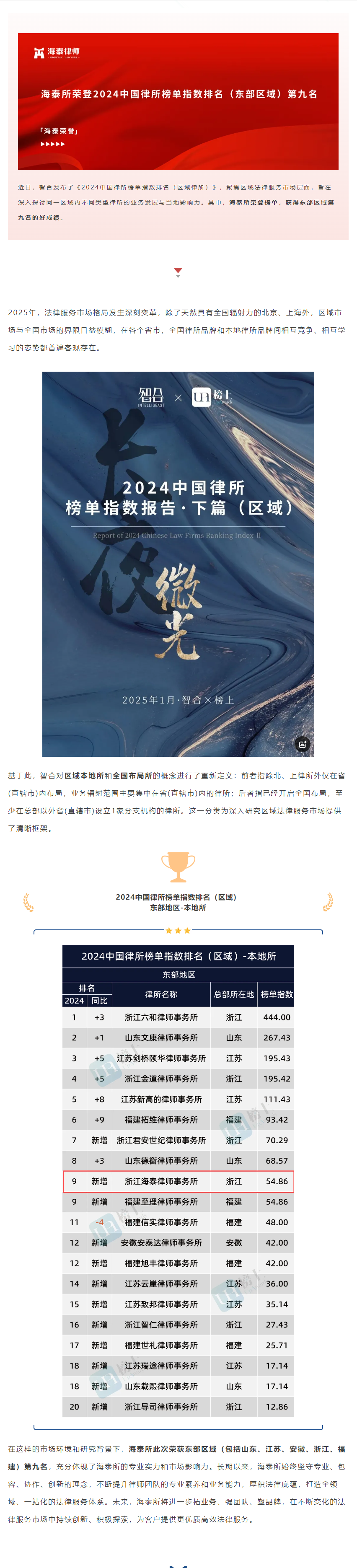 海泰所荣登2024中国律所榜单指数排名(东部区域)第九名