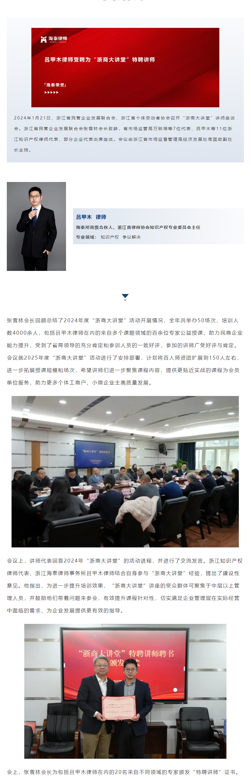 吕甲木律师受聘为“浙商大讲堂”特聘讲师