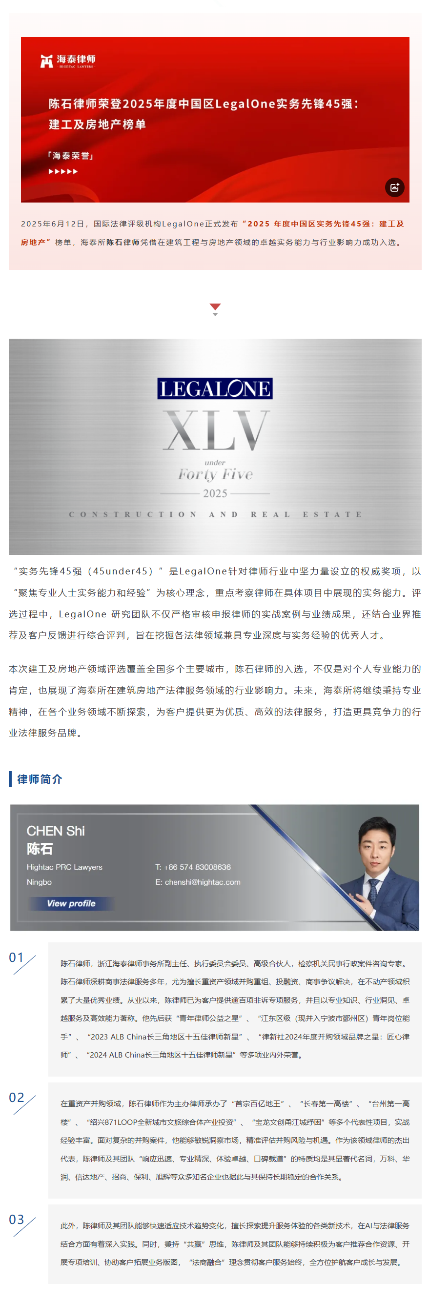 陈石律师荣登2025年度中国区LegalOne实务先锋45强:建工及房地产榜单
