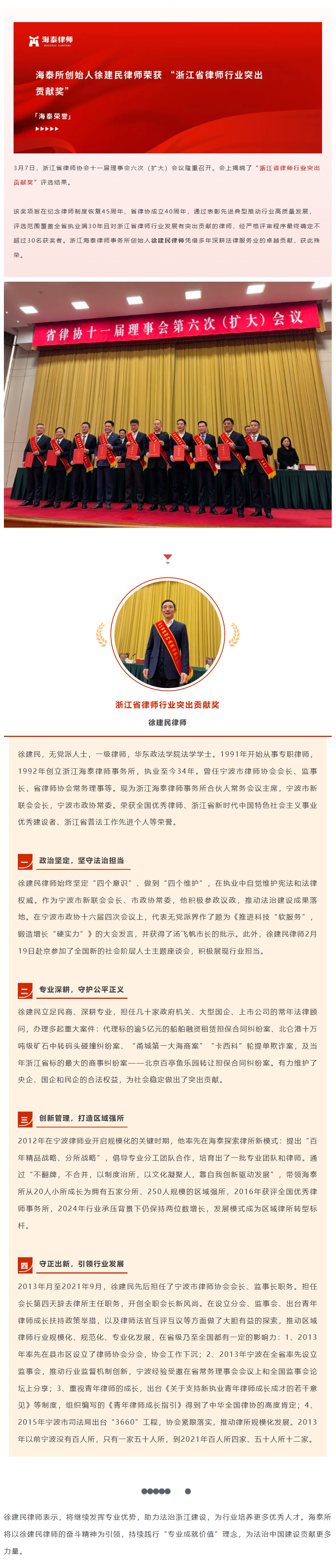 海泰所创始人徐建民律师荣获 “浙江省律师行业突出贡献奖”