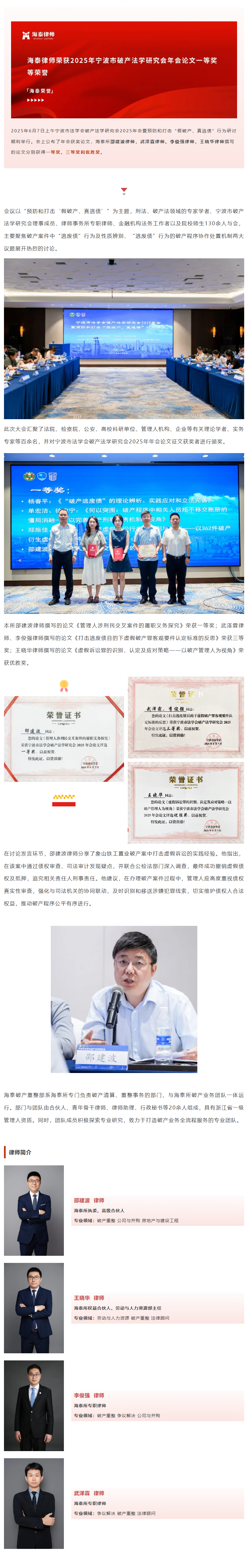 海泰律师荣获2025年宁波市破产法学研究会年会论文一等奖等荣誉