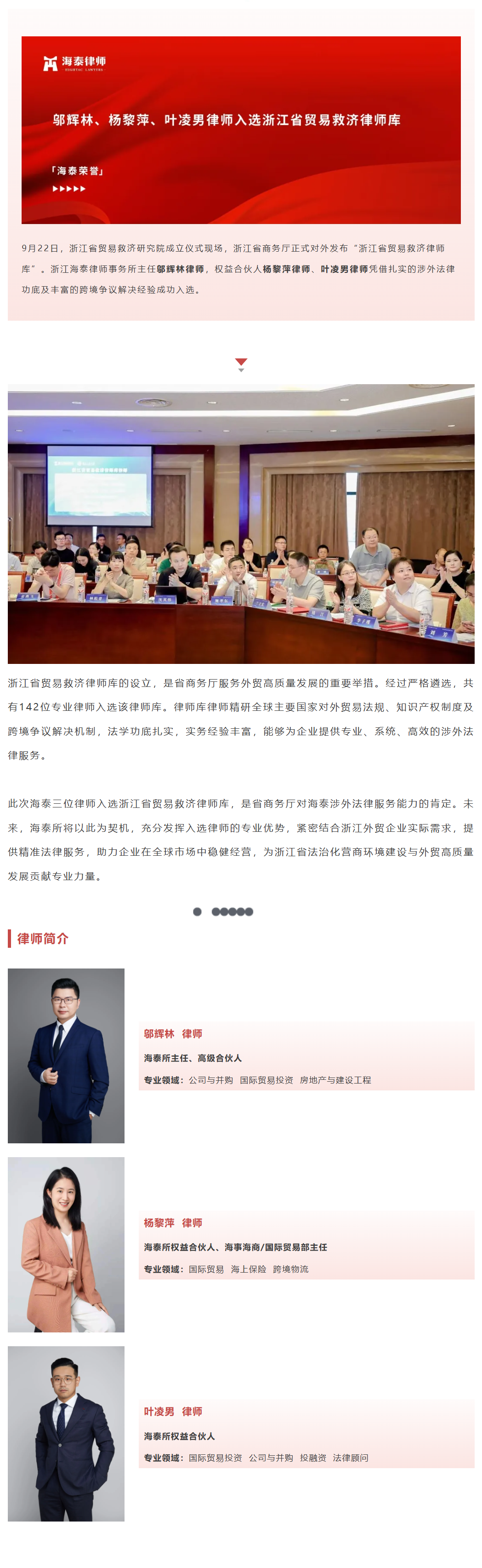 邬辉林、杨黎萍、叶凌男律师入选浙江省贸易救济律师库