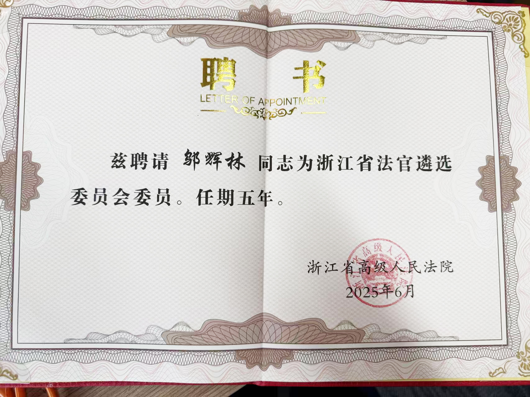 邬辉林律师被聘为浙江省法官遴选委员会委员