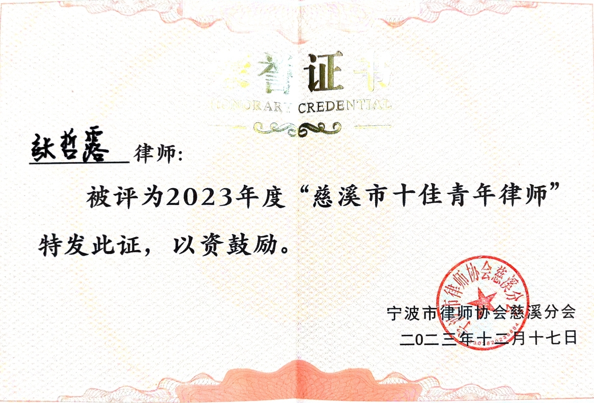 张哲露律师荣获2023年度“慈溪市十佳青年律师”