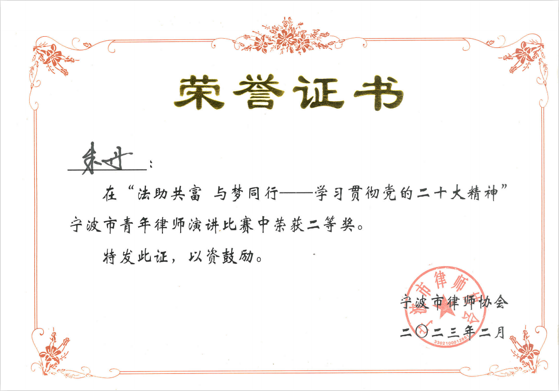 朱丹律师荣获宁波市青年律师演讲比赛二等奖 | 海泰荣誉