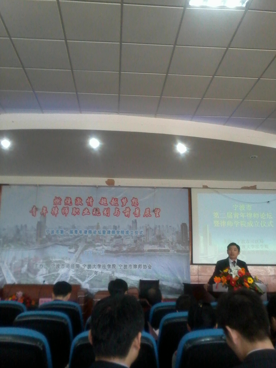 2011年11月20日,宁波市司法局、宁波大学法学院、宁波市律师协会在宁波大学阳明学院二楼报告厅举办“宁波市第二届青年律师论坛”。继在海泰所内部的青年律师系列培训中首讲青年律师如何制定职业规划后,在本次青年律师论坛上,海泰所主任徐建民进而为全市青年律师做了“赢在起点、青春无悔”为主题的精彩演讲。