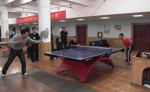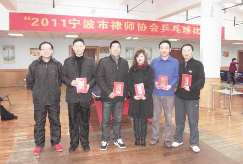 虽然天气寒冷,虽然周六律协有重要的学习活动,2011年12月17日,市律协乒乓球比赛依然吸引了30余位选手参加,宁波华茂外国学校乒乓球馆内人生鼎沸,击球声、喝彩声此起彼伏,从早上9点一直鏖战到下午3点多才决出最后名次。本次比赛来自煜华所的钱宏伟、高方军扮演了二匹最大的黑马,先后把上届亚军海泰所徐建民、冠军甬港所的郭继跃斩下马来,最后会师决赛。黑马钱宏伟的取胜秘笈是弧旋球,技术如火纯情,见球就拉,成功率在百分之八十以上,火力了得。黑马高方军的取胜秘笈则是其用的长胶球拍,一般业余选手用的都是反胶,对付长胶相当头痛,而且高方军长胶用的非常娴熟,把其他选手的凌厉攻势轻易化解掉,防守滴水不漏。一矛一盾相会在决赛,而且两人都非常熟悉,打得难解难分,精彩纷呈,把整场比赛带入了高潮。最后,还是钱宏伟技高一筹,勇夺男子单打冠军,高方军屈居亚军。波宁所的王怀伦,阳明所的孙曙光分获三,四名。甬港所的郭继跃,海泰所的徐建民分获五,六名。宁波律协男子乒乓新人辈出,技术先进,大大增强了律协乒乓球在省内的竞争力。