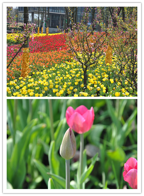 一入园,便进入了郁金香的海洋。各种颜色,红的、白的、粉的、紫的,五颜六色,令人陶醉。那一梗梗壮实的花茎,向上托了朵朵柔美的花,宛然一只只典雅的高脚酒杯,在春水的倒映下更加别致。大家被这满园的美景所吸引,纷纷合影留念,欢快之情溢于言表。