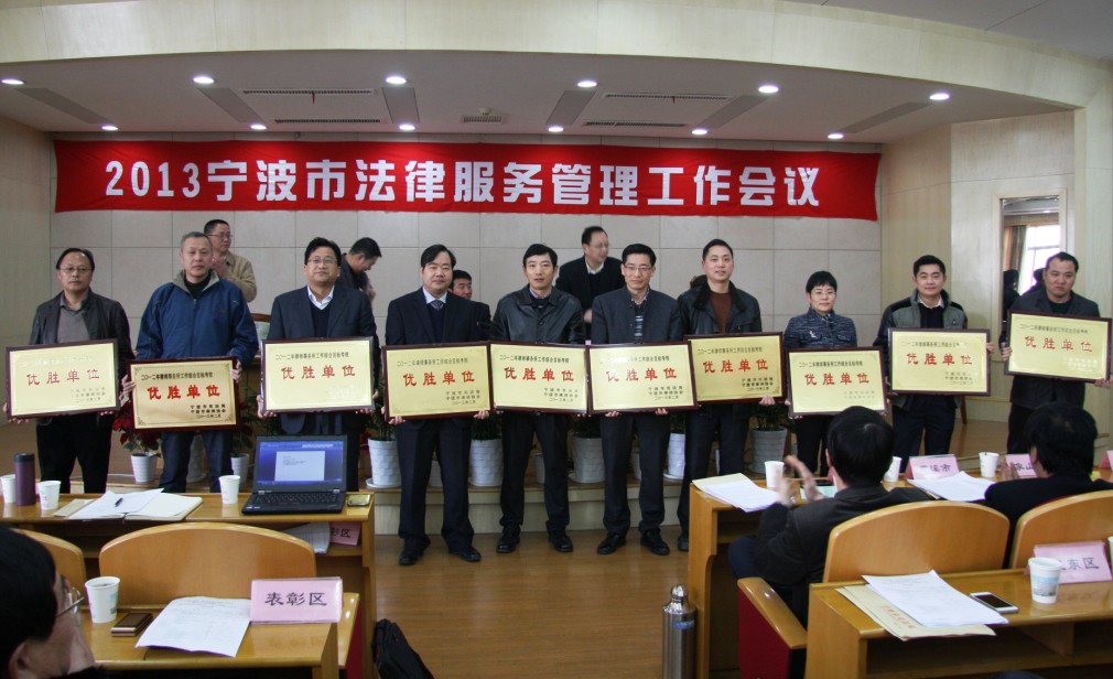 2013年3月3日,全市法律服务管理工作会议在市委党校召开。会议由市局律管处副处长蒲明祥主持,并通报表彰了一年来我市法律服务行业取得的各类荣誉奖项。其中,在市司法局、市律师协会、各市(区、县)司法局对全市128家律师事务所进行的年度考核中,浙江海泰律师事务所以第三名的综合考核得分,荣获2012年市属律师事务所工作综合目标考核优胜单位。