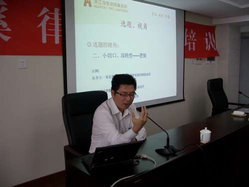 培训由范红枫副会长主持。论文研讨一块主要围绕“为什么写,写什么,怎么写”三节展开。首先由宁波市律协监事长、《宁波律师》主编杨根飞律师开讲。他结合自己的切身体会,现身说法,直截了当向慈溪同行抛出了写论文的三大好处:提高理论研究能力和业务操作技能,以便更好地为客户提供服务;获得客户的认可,带来更多的业务;获得业内认同,树立行业地位。杨律师还特别强调,这三者相辅相成,相得益彰。杨律师的动员报告采用完全的大白话,由浅入深、娓娓道来,既高屋建瓴,又贴近实际,听课者似赏行云流水,于轻松间得到启迪、励志与滋养,不知不觉间三十分钟就过去了。接着作辅导的是律协副秘书长、海泰律师沙龙主策划人、论文写作高手邬辉林。他以敦厚沉稳又不失幽默的讲演为听课者讲解律师如何结合实务工作撰写论文。他通过对去年宁波律师实务理论研讨会获奖论文的评点,就实务论文撰写的切入点及选题等内容进行了开示,闪烁智慧和风趣的表达不时引来阵阵会心的欢笑。接邬辉林律师之后,另一位论文高手、律协理事兼