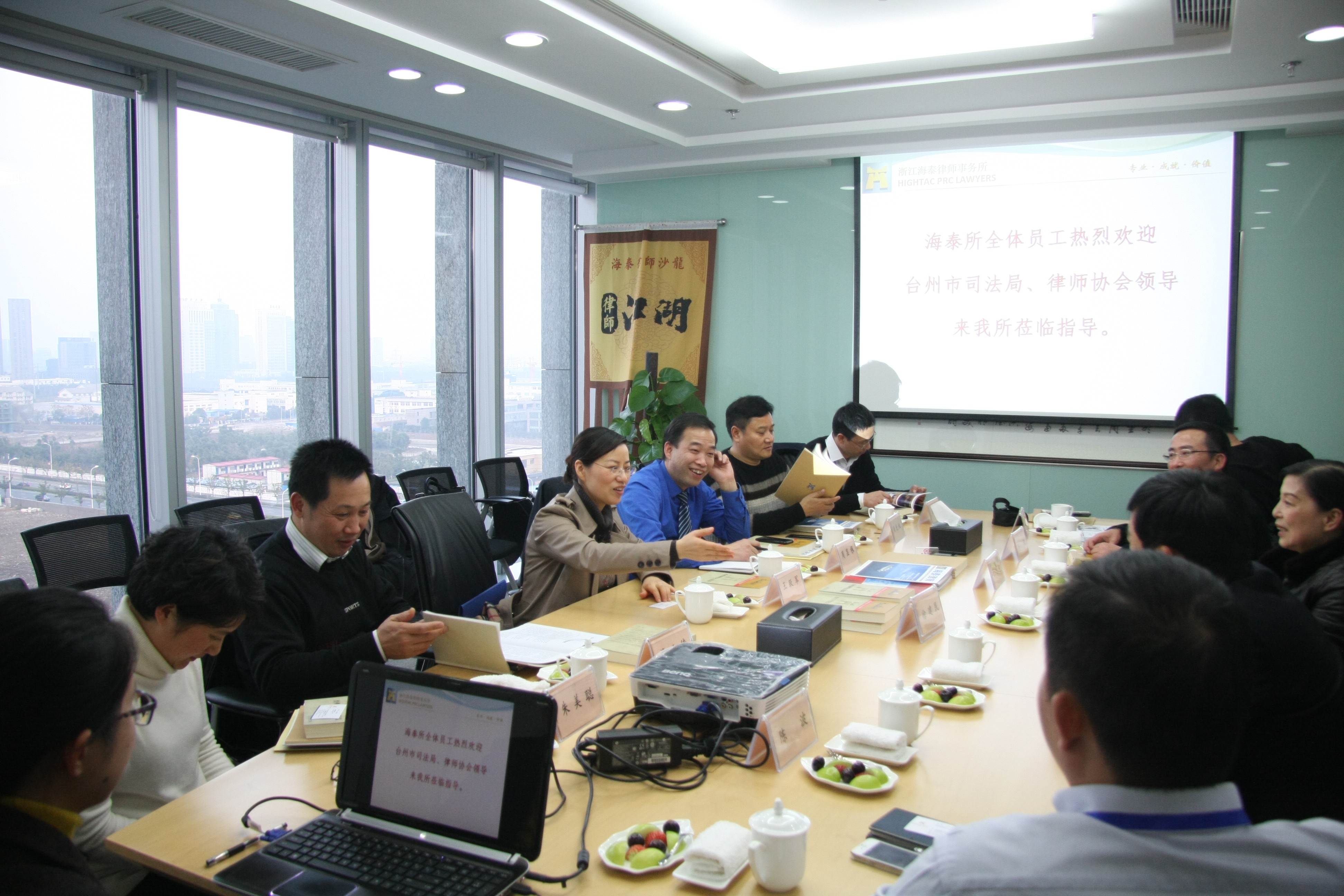 2013年19日下午,在台州市司法局副局长、台州市律律师协会党委书记王跃军带领下,一行8人来海泰所考察交流,他们首先参观了海泰所的办公环境;尔后听取了由杨黎萍用PPT形式介绍的海泰所发展情况、组织架构、办所理念、创新改革、业务特点、工作亮点等情况;最后由市律师协会会长徐建民、本所主任陈波回答了考察组提出的就律所发展、理论研究、分配制度、办公室购买及设计等相关问题,并就共同关心的与事务所发展相关的问题开展了热烈的交流与讨论。