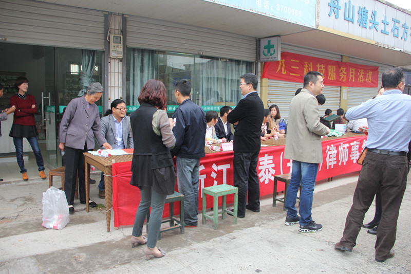 2014年5月10日上午,虽然天公不做美,下起了绵绵细雨,在普陀区东港街道塘头社区却演绎着温暖的一幕,由我所陈波律师所在的九三舟山科技支社组织的下乡服务活动正在这里举行。本次活动特别邀请了浙江海泰(舟山)律师事务所、舟山市农业科学研究院、九舟医疗诊所等十多位社内外专家,为塘头社区60余名村民诊治服务,赠送常用药品1800余元,发送各类宣传资料近500份。期间还有法律、农业科技、房屋建造的咨询服务,受到了当地村民的欢迎。舟山市政协副主席九三舟山市委会主委张昌义、专职副主委杨莺莺、市统战部党派处李思飞处长等人一起参加本次活动。