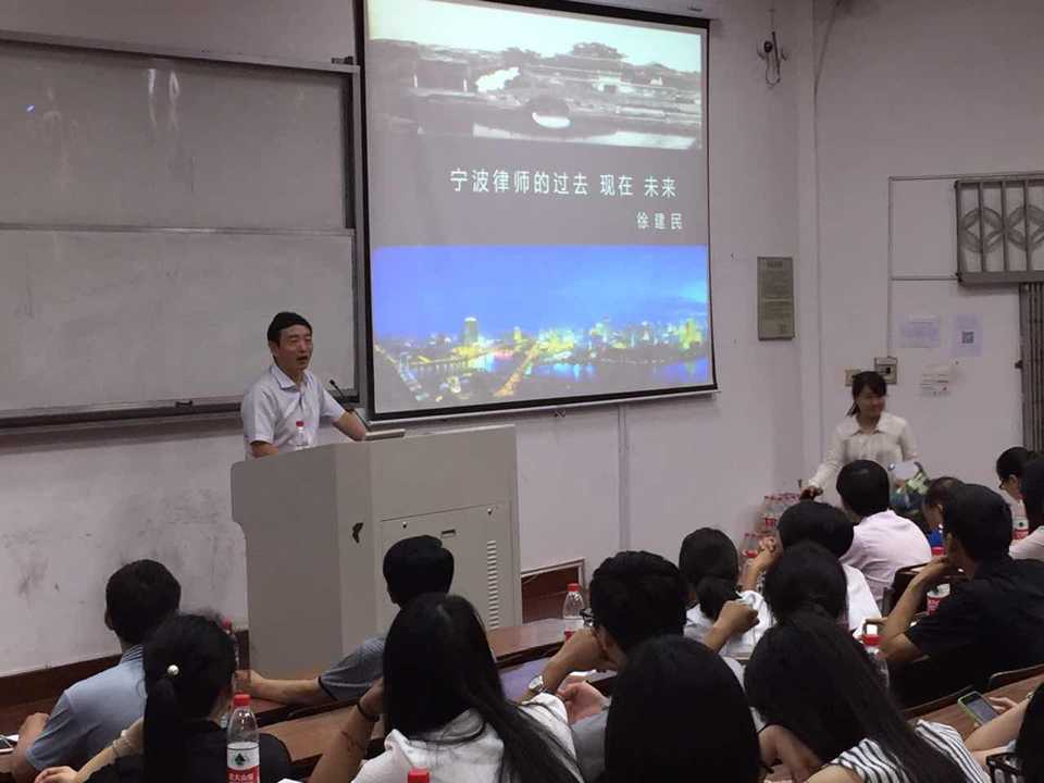 市律协会长、海泰所徐建民律师为现场青年律师作了题为《宁波律师的过去 现在 未来》的开营演讲。徐建民律师在数十年丰富的执业经历中,曾听闻、亲历许多甬城老一辈如三十年代的朱酇卿、毛翼虎律师,五十年代陶良作、范无求律师的光辉事迹,并结合演讲筹备过程中阅读的大量的相关史料文献,为青年律师完整梳理了甬城大地深厚的律师人文史,以及他们为甬城法治事业建设所作出的巨大贡献,进而引导现场学员深刻体悟“律师兴则国家兴 律师衰则国家衰”的历史规律。之后,徐建民律师通过科学的数据统计,用图表的形式向大家介绍了宁波律师近十年来在人员规模、业务创收等方面的蓬勃发展势头,向大家传达了“现在是理想与现实齐飞的时代”这一巨大信心。最后,徐建民律师带领大家面向未来,分析了包括“法治中国”、“互联网+”、“2025中国制造”、“一带一路”等几大国家宏观层面有利律师业进一步发展的利好趋势,再次为青年律师对行业发展前景注入满满的正能量。徐建民律师告诫大家在着眼大局的同时,务必要戒骄戒躁、脚踏实地地磨练专业技能,做到扎实掌握专业知识乃至跨行业知识,寄语大家能够在未来律师行业进入“品牌化”、“规范化”、“国际化”、“信息化”的大时代浪潮中,展翅高飞,有所作为。徐建民律师内容翔实、声情并茂的现场演讲可谓精彩不断,期间引发听课学员笑声连连。