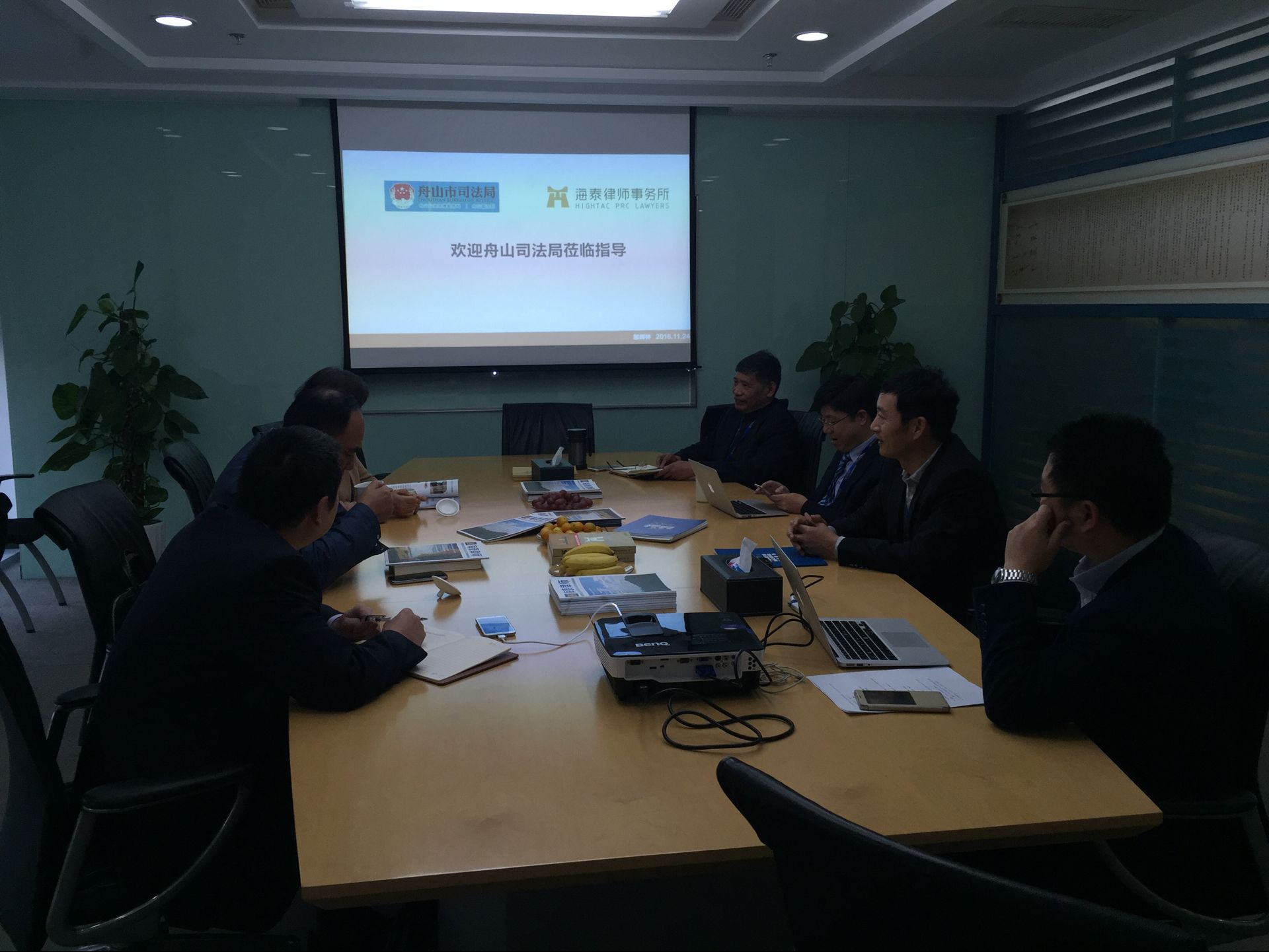 11月25日,舟山市司法局徐烈副局长、法律服务管理处岑海玲处长在陈波(舟山)主任的陪同下莅临海泰交流、指导。徐建民会长、邬辉林主任、邵建波执委参加交流活动。