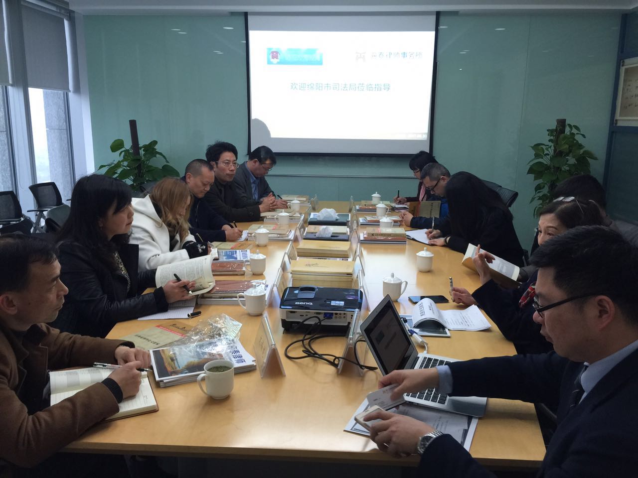 2017年3月30日下午,在宁波市司法局副局长盛志强、律管处处长王明珍陪同下,四川省绵阳市司法局副局长罗苑瑗、绵阳江油市司法局党组书记局长郭从明等一行九人来到本所考察,海泰所主任邬辉林、行政执委杨建龙全程参与会议交流。