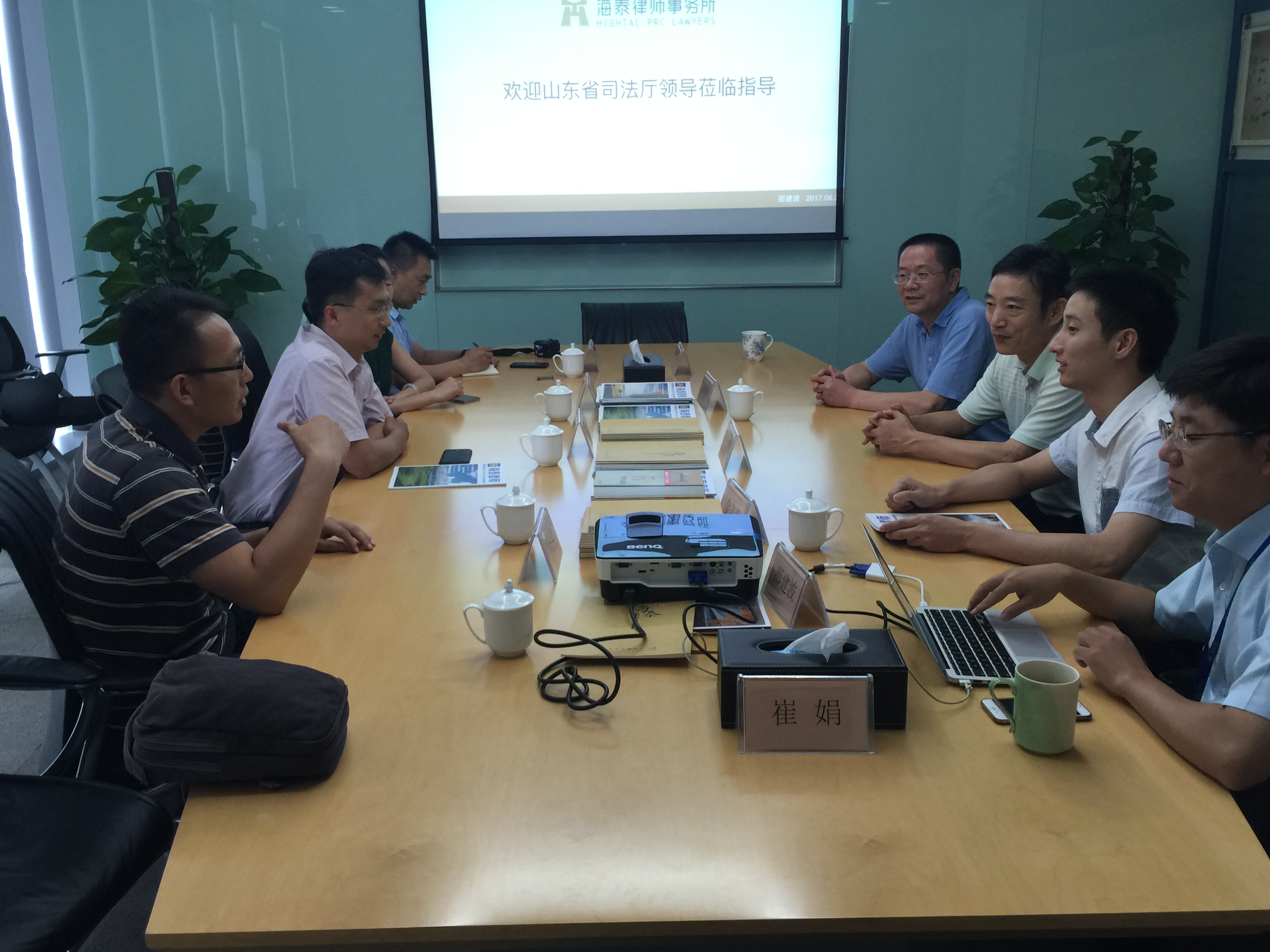 2017年6月22日,山东省司法厅领导一行六人赴我所交流,海泰所高级合伙人徐建民、执委邵建波、张剑锋、宁波市司法局律管处副处长蒲明祥参加交流会议。