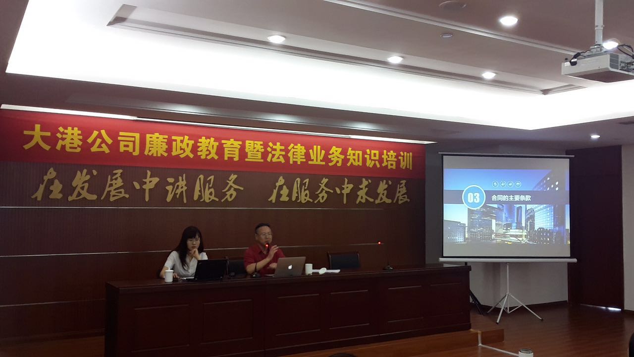 2017年9月15日上午,海泰开发区分所主任石剑平律师受顾问单位宁波经济技术开发区大港开发有限公司邀请,为大港公司全体职工讲授了题为《实用合同法知识》的培训课程。