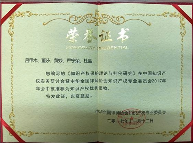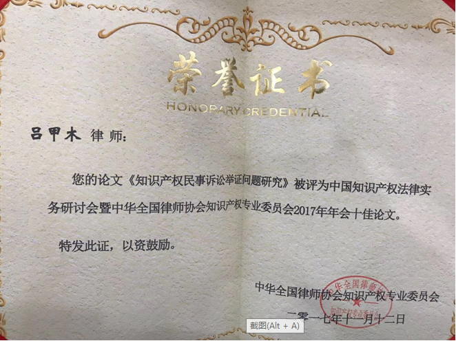 本次论坛还就本年度知识产权十佳论文与优秀论文、知识产权著作和知识产权十佳典型案例与优秀案例做出评选并颁发荣誉证书,予以表彰以资鼓励。其中我所吕甲木律师撰写的《知识产权民事诉讼举证问题研究》一文被评为十佳论文第三名,继2011年、2013年、2015年、2016年后第五次蝉联十佳论文。吕甲木、黄妙、严宁荣、杜晶编写的《知识产权保护理论与判例研究》一书与其他委员撰写的共四部著作被推荐为优秀知识产权读物。