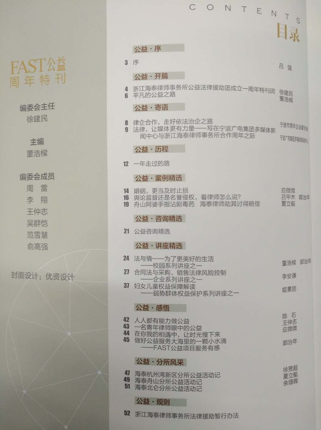 2017年终,海泰公益律师团队一周年特刊正式付印。此本特刊精选记录了自2016年8月8日正式启动的一年多以来,海泰公益律师的所作所为、所思所感,并邀请到司法局、宁波市青年企业家协会、宁波市电视台等合作单位见证与支持,并第一次正式公布《浙江海泰律师事务所法律援助暂行办法》。