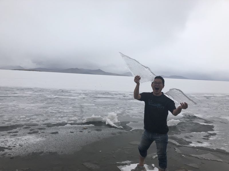老远,领队说快到了的时候,我们以为普姆雍措被藏在一片绵延的云海下了,近看,才发现,我们以为的云海,便是普姆雍措。只是对于我们这些南方人而言,何曾见过这千里冰封的景象。扑面的冷气和高海拔的不适应,阻挡不了我们的兴奋,迫不及待走近冰湖,去近距离感受普姆雍措的魅力。不同于羊卓雍措的秀美和圣洁,普姆雍措美得宁静、原始、圣洁。湛蓝的天,流动的云,依稀的雪山,和冰湖相映,在这里,不需要思考,摈除杂念,只想静静地感受此刻的宁静。