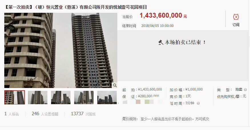 14.336亿元,成交!2018年6月5日上午10点,由恒元置业(慈溪)有限公司开发(以下简称“恒元慈溪公司”)的位于慈溪市环杭州湾创新中心(原慈溪文化商务区)的“悦城壹号花园”住宅项目土地使用权和在建工程的司法网拍结束。这是浙江海泰律师事务所作为破产管理人负责的网拍标的额最大的企业