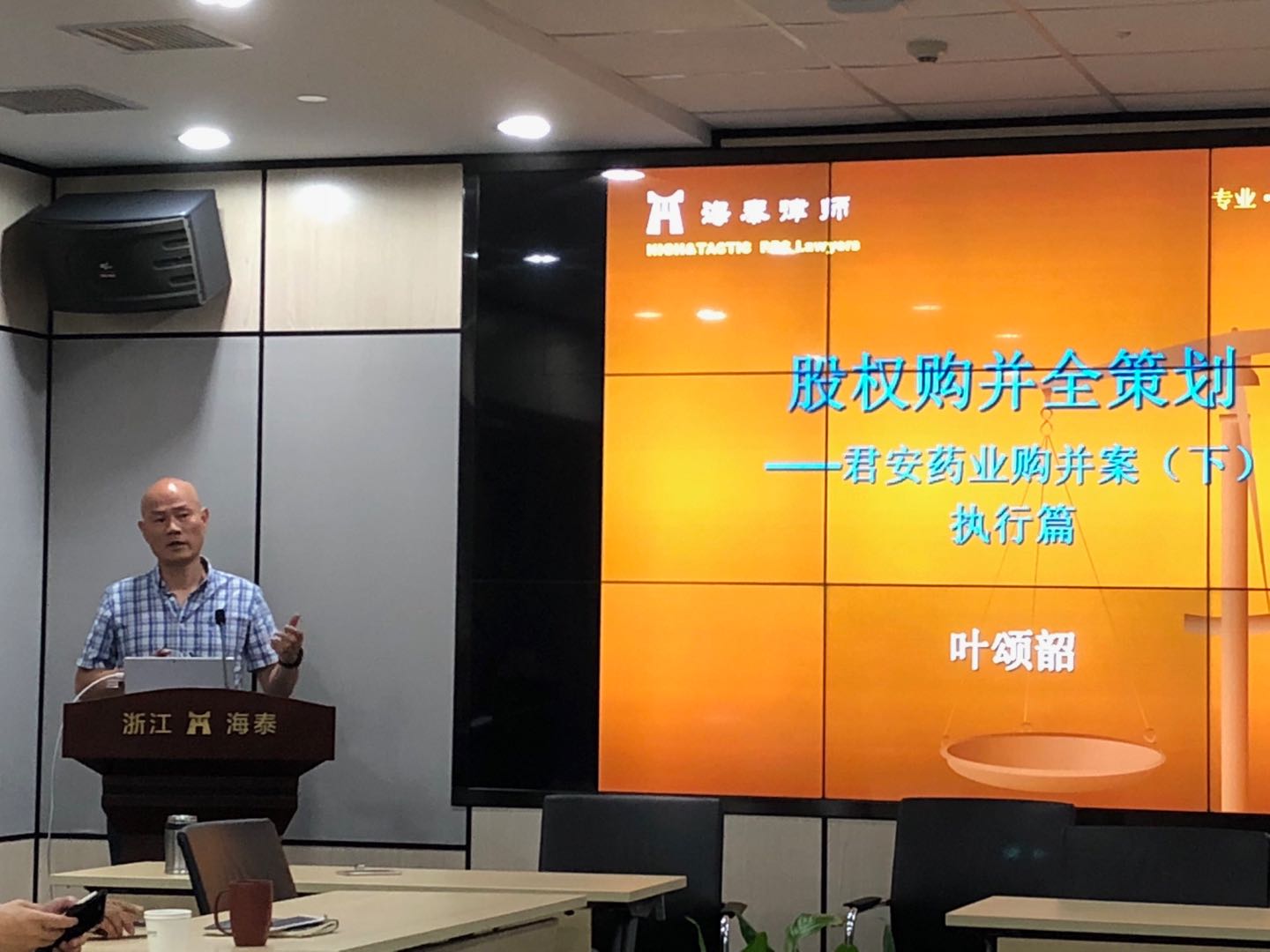 2018年6月19日,第五期“海泰讲堂”在浙江海泰律师事务所总所第八会议室如期进行。事务所权益合伙人、纪监委主任叶颂韶律师接上期“海泰讲堂”,再次以“股权购并全策划——君安药业购并案(下)执行篇”为主题与所内三十余名律师进行业务分享。
