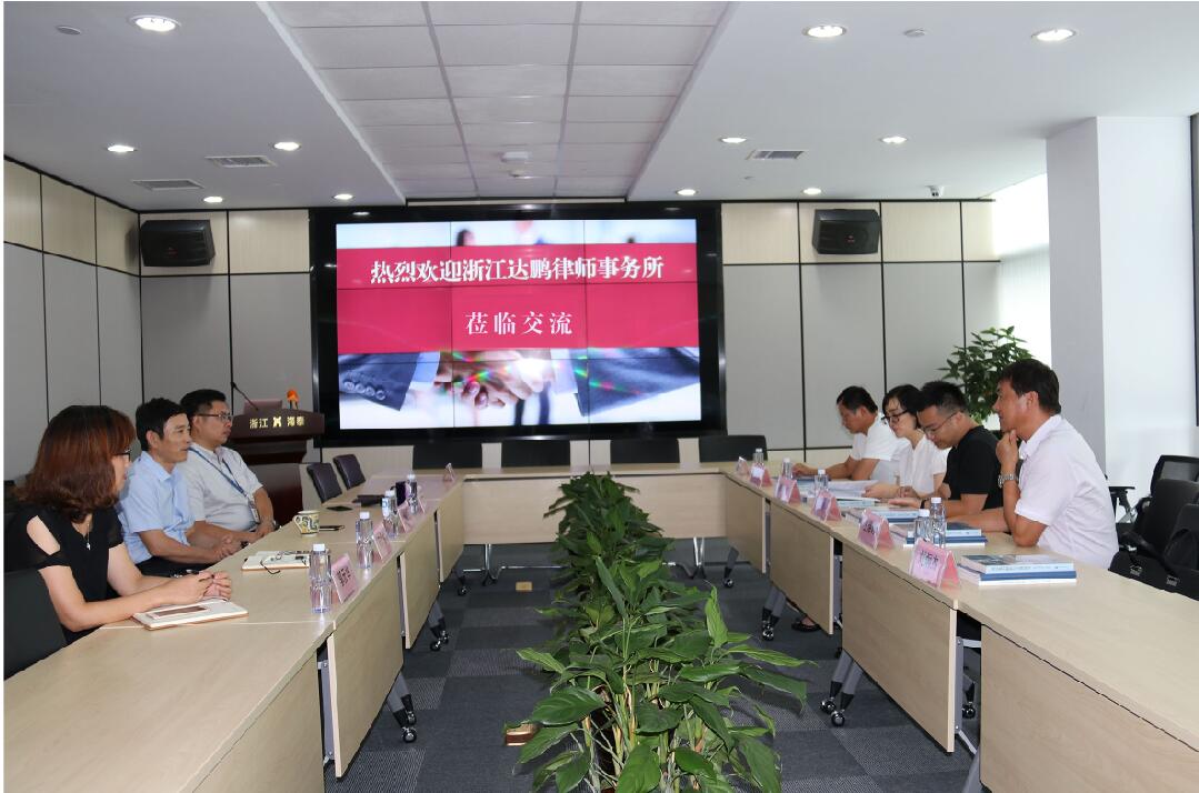 2018年8月16日下午,浙江达鹏律师事务所主任徐剑,副主任王海峰、罗玲芳,商事部主管许建能一行莅临海泰律师事务所交流。海泰所主任邬辉林、高级合伙人徐建民等参加了座谈交流。