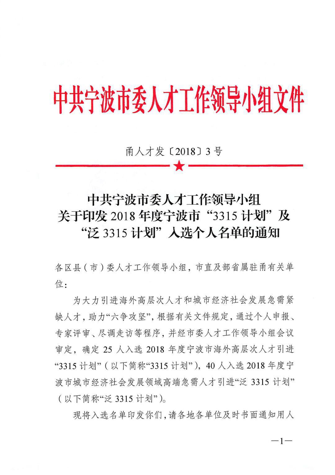 近期,中共宁波市委人才工作领导小组公布了《关于印发2018年度宁波市“3315计划”及“泛3315计划”入选个人名单的通知》(甬人才发〔2018〕3号),其中有25人入选2018年度宁波市海外高层次人才引进“3315计划”,40人入选2018年度宁波市城市经济社会发展领域高端急需人才引进“泛3315计划”。