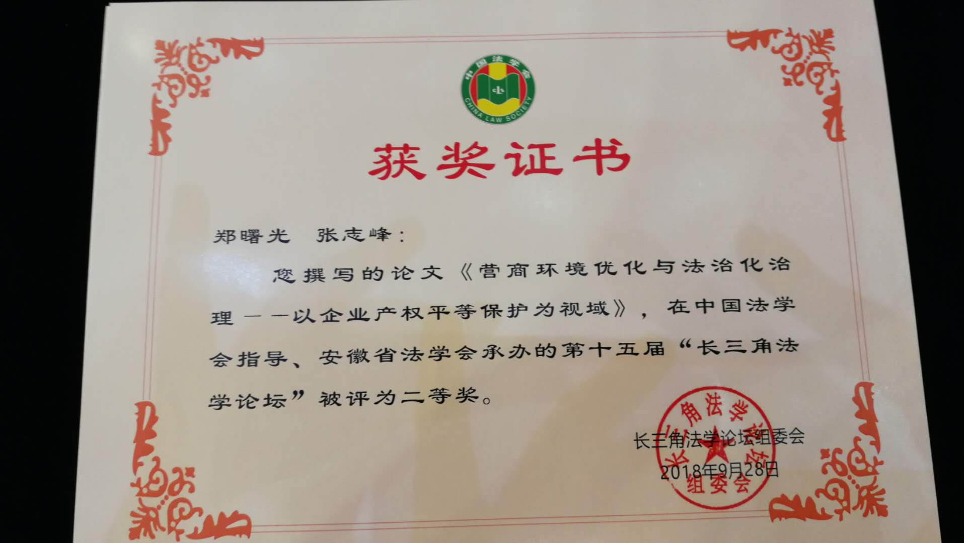 本次论坛的主题是:“城乡融合发展的法治保障”,论坛组委会围绕主题在论坛区域内广泛征集论文,共收到征文877篇,经论坛组委会初评,中国法学会终评,共131篇论文分获一至三等奖。其中海泰所郑曙光律师撰写的《营商环境优化与法制化治理——以企业产权平等保护为视域》的论文,获得第十五届“长三角法学论坛”论文评比二等奖。