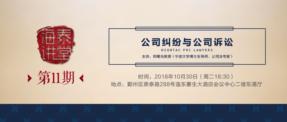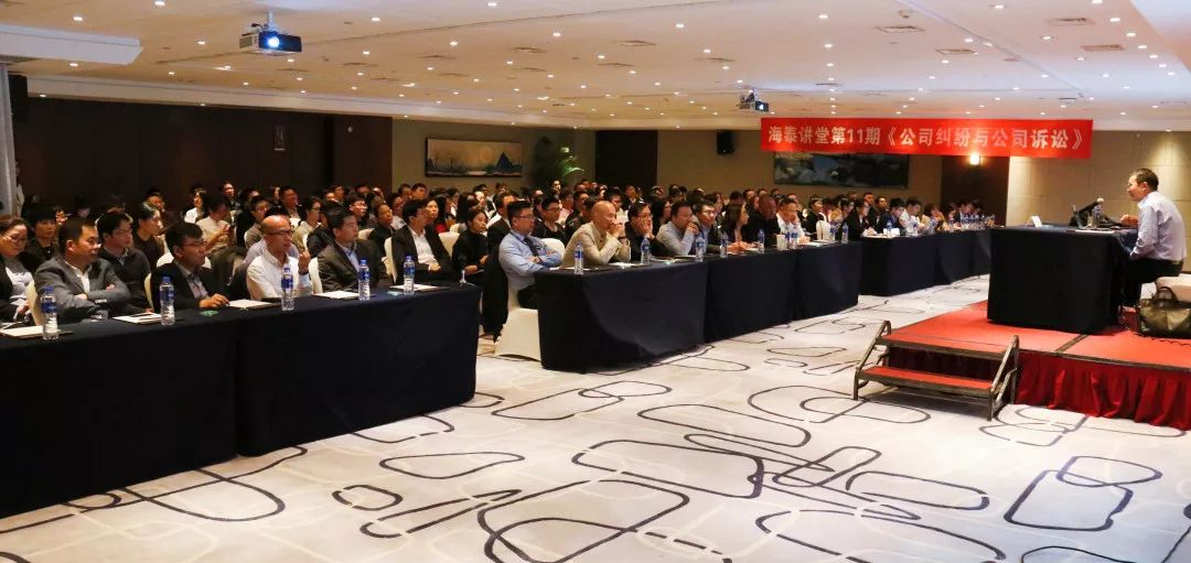 本期讲座,由宁波大学法学院教授、博士生导师、著名公司法专家、海泰所执业律师郑曙光讲授《公司纠纷与公司诉讼》。这次讲座有来自所内80+名律师,所外110+名同行律师、公务员、银行高管、上市公司高管、企业界股东、高管及法务人员等社会各界人士。海泰所合伙人、执委会执委吕甲木律师主持了本次讲座。