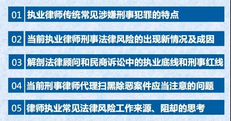 近期律师执业刑事风险较多发生于律师在提供法律顾问、借贷诉讼等民商事业务领域,张友明律师就这一现象的深层原因进行了剖析。民商事律师在为当事人提供法律顾问、代理民商事诉讼等法律服务的过程中,不可避免要提供意见、实施代理行为。但是一旦涉及到服务对象如果实施了涉嫌违法、犯罪行为时,民商律师提供的法律服务,就可能与服务对象的犯罪、违法行为发生某种牵连;那么律师提供此类法律服务的执业底线、红线究竟在哪里?在律师提供正常法律服务、违规违章执业、参与共同犯罪以及执业豁免各者之间的边界又如何区分?在正常执业中如何学会自我保护?这些是张友明律师本次授课的重点。