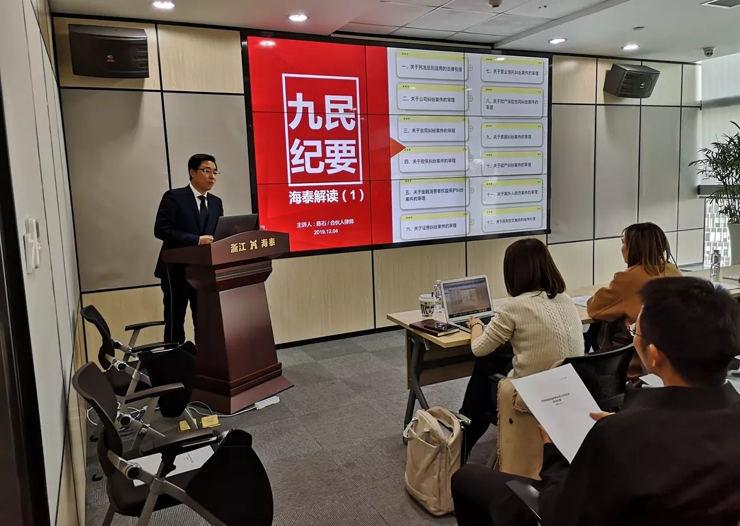 2019年12月4日下午,海泰《九民纪要》系列讲座第一讲在海泰讲堂火热开讲,主讲人、权益合伙人陈石律师初步为大家分享了最高人民法院最新出台《全国法院民商事审判工作会议纪要》法律知识。近20位企业法务和所内50余名律师、律师助理参加了本次交流学习。