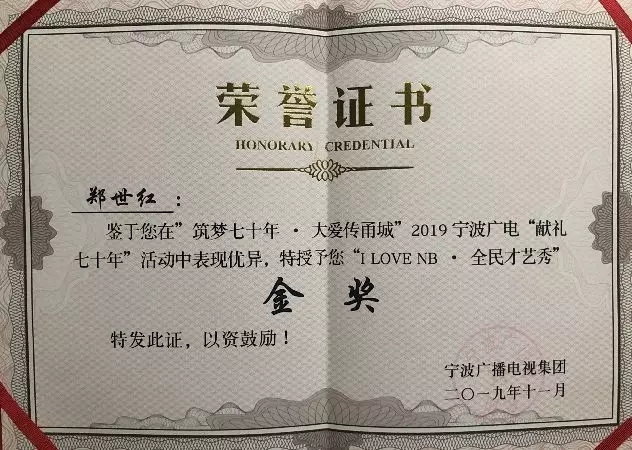 我所郑世红律师精心编排华丽亮相,经过激烈角逐筛选后脱颖而出,一曲唱尽祖国七十年风云巨变与春华秋实的礼赞,被宁波广电授予金奖,成为海泰当之无愧的“金嗓子”。