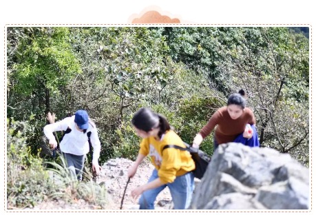 爬山既是一种锻炼身体的好方式,又能让人亲近自然、心情平静。而平日里都身处都市丛林的我们,坐惯了电梯,走惯了坦荡的大马路,乍一踏上这种狭窄坎坷的羊肠小道,既觉得新奇,又感到紧张,不少人没过多会儿就开始气喘吁吁。爬山的过程比想象中更加富有挑战性,还好,有了同伴的帮扶和鼓励,再陡峭的山头也能翻越过去。