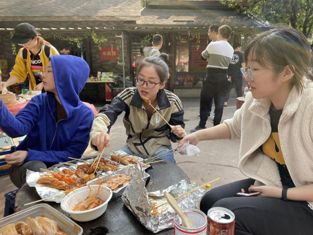 在我们一行人踏着胜利的步伐回到山脚下的村庄之时,已是中午十二点半。在这里迎接我们的,是已经架好炉子、生好火的农家烧烤。在高强度的爬山运动之后,以美味的烧烤来安抚我们的辘辘饥肠实在是再合适不过了。